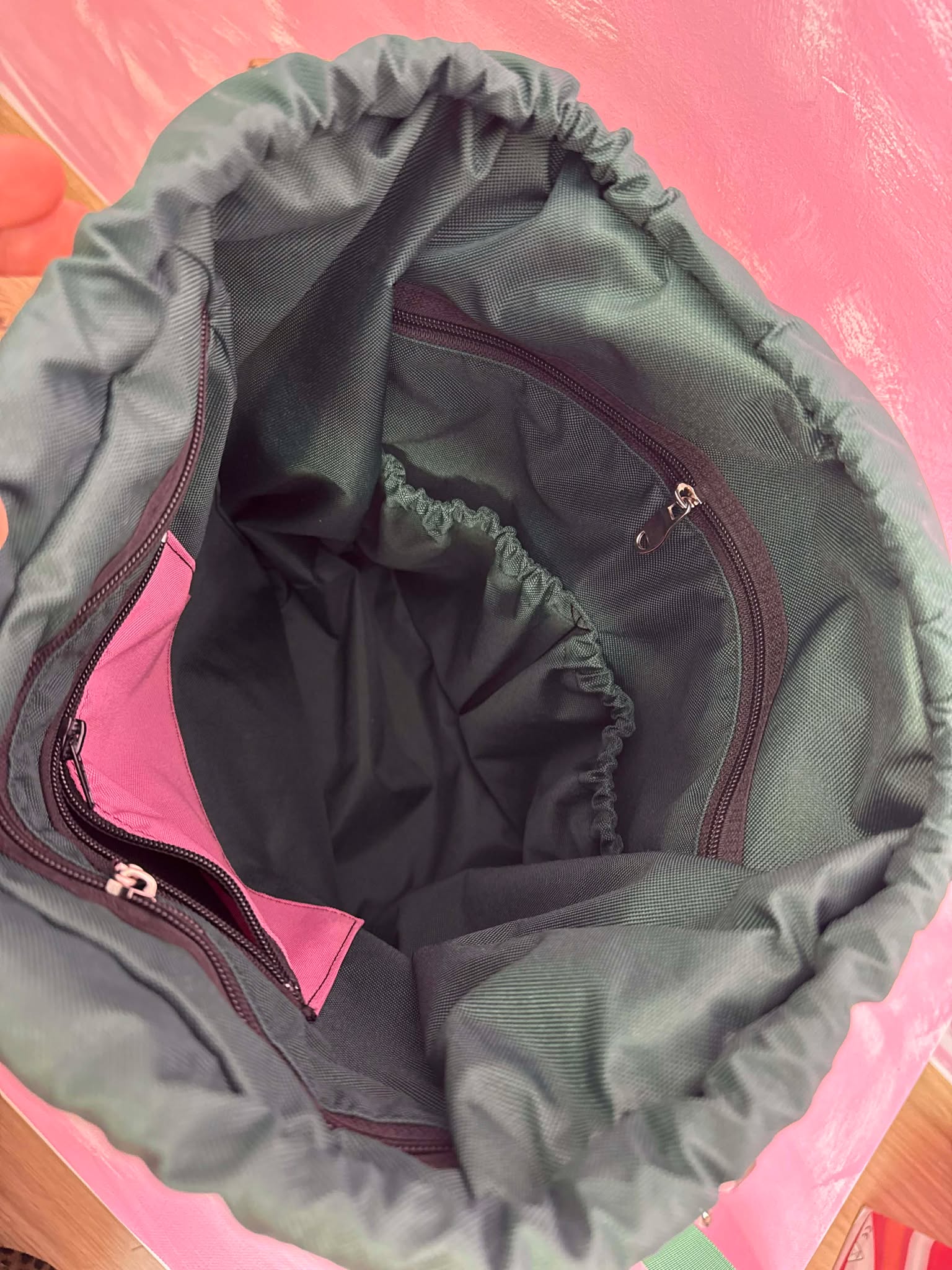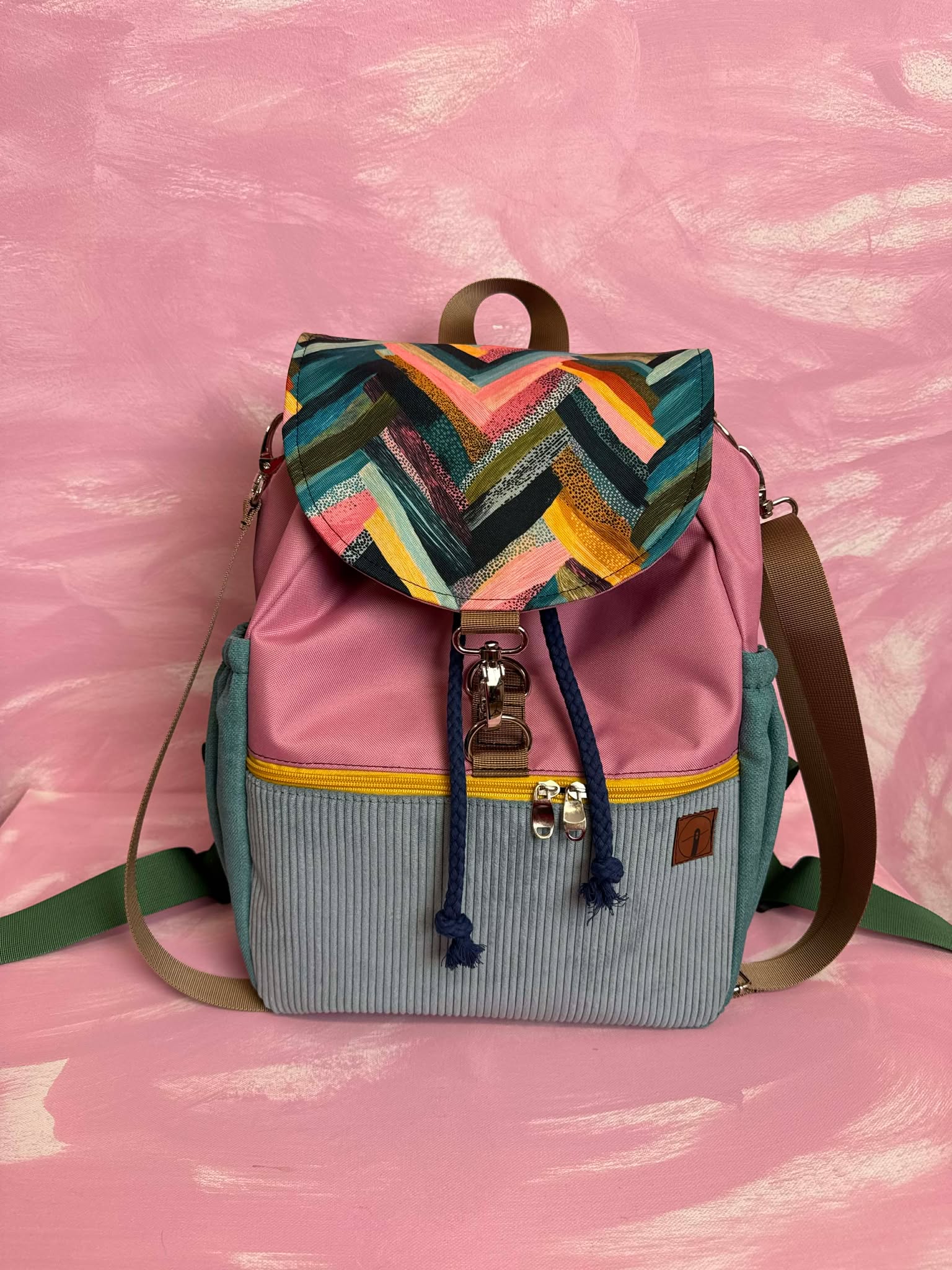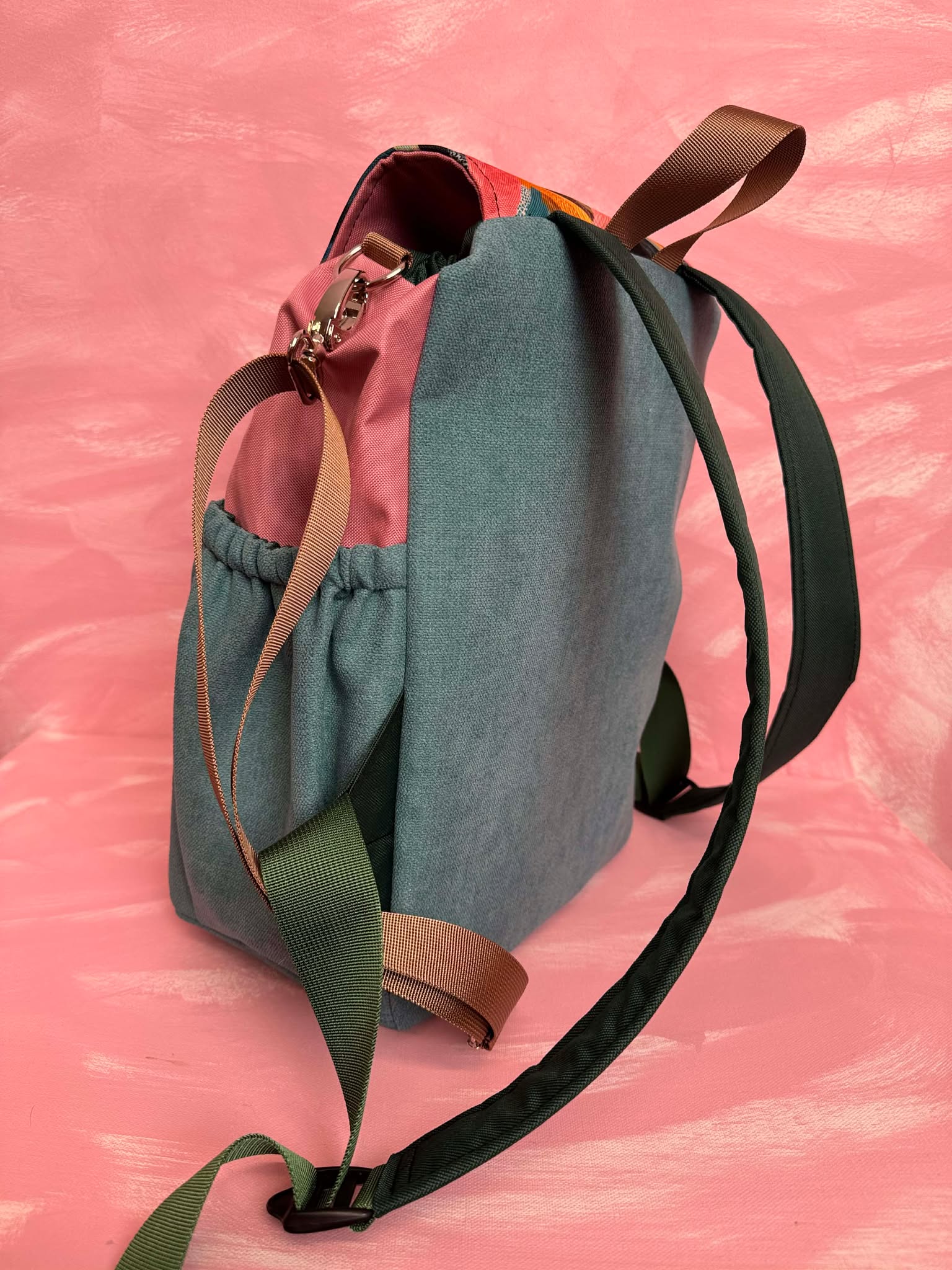 Plecak uszyty jest z wysokogatunkowego materiału tapicerskiego deadstock oraz materiału wodoodpornego